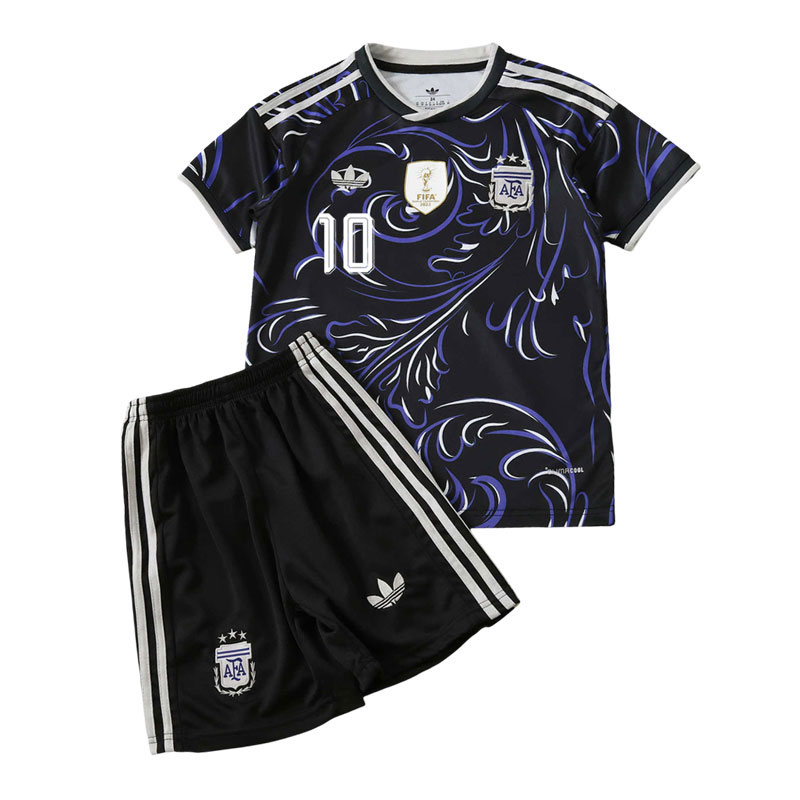Das Argentinien Kinder Fußballtrikot WM 2026 Auswärts begeistert mit einem ausdrucksstarken Design in Schwarz, kombiniert mit weißen und himmelblauen Details – eine Hommage an die Leidenschaft und Kreativität des argentinischen Fußballs. Inspiriert von künstlerischen Formen zeigt das Trikot ein dynamisches, geschwungenes Muster, das sofort ins Auge fällt und dem Kinder Trikot Set einen modernen Look verleiht.